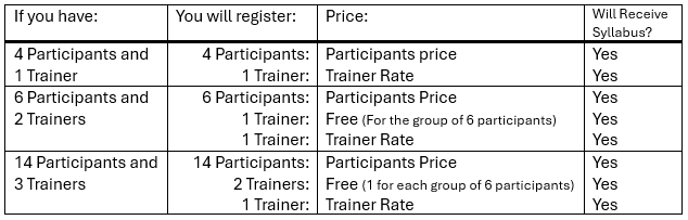 Trainers must register. For every 6 registered participants, you will receive a Free Trainer Registration, which includes a Syllabus. Registration for additional trainers is $20 and also includes a Syllabus.