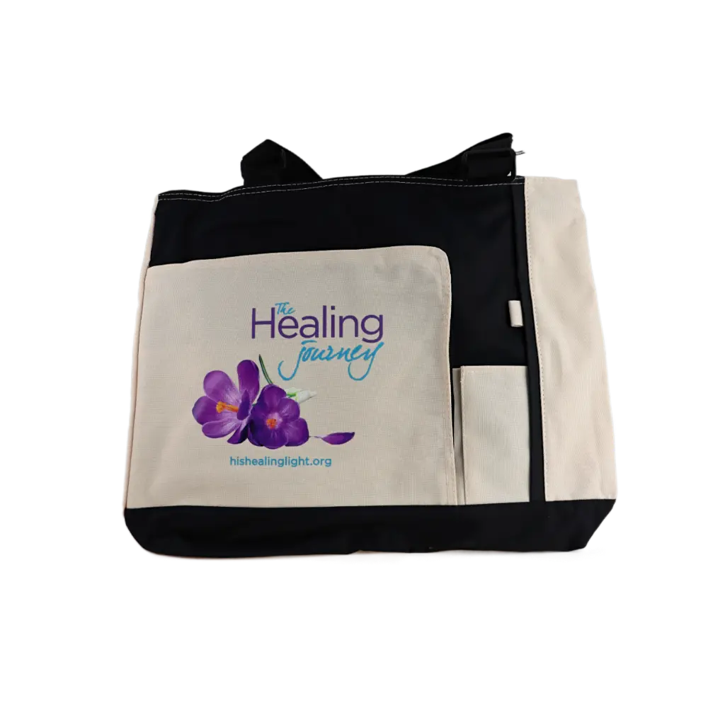 This 18” x 15” bag features the Healing Journey logo, a large zippered compartment, a smaller zippered compartment in the front, a pocket for phone or glasses, and a loop for a pen. The woven handles adjust for carrying on the shoulder or arm. Washable.